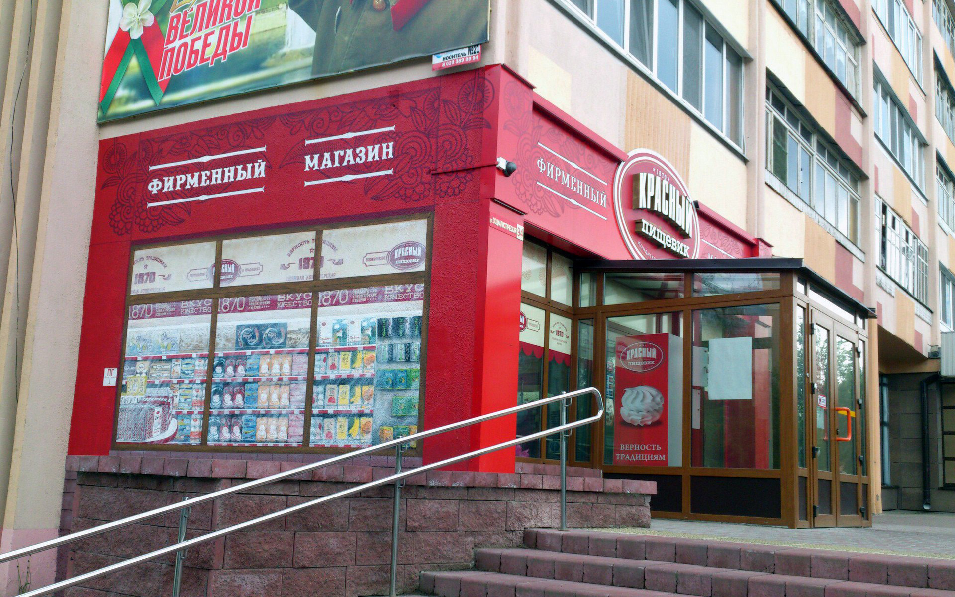 Роспись стены магазина «Красный пищевик» .На стене фирменного магазина, нарисовали имитацию окна с изображением интерьера магазина, а та же повторили вывеску и текстуру облицовочной плитки.