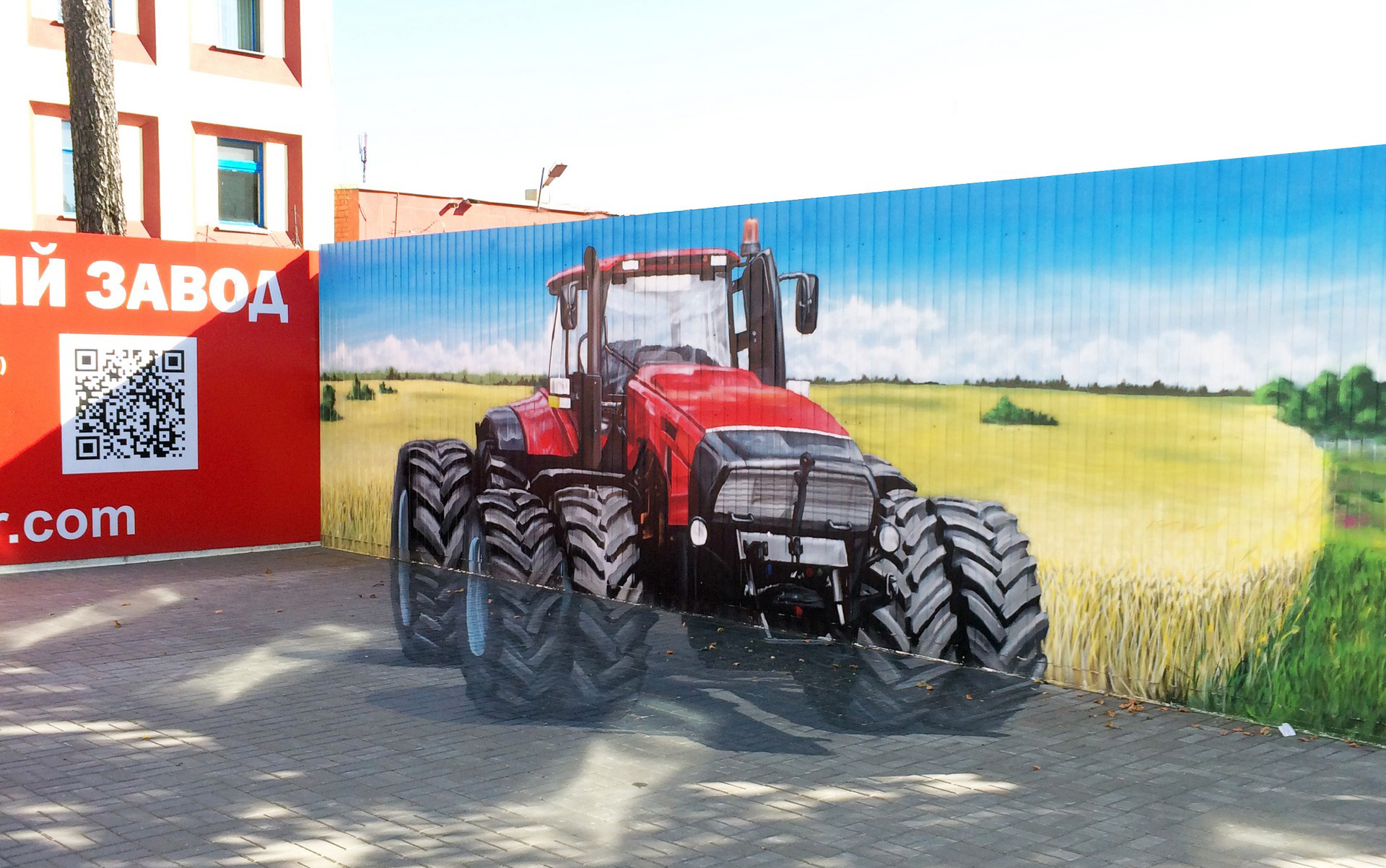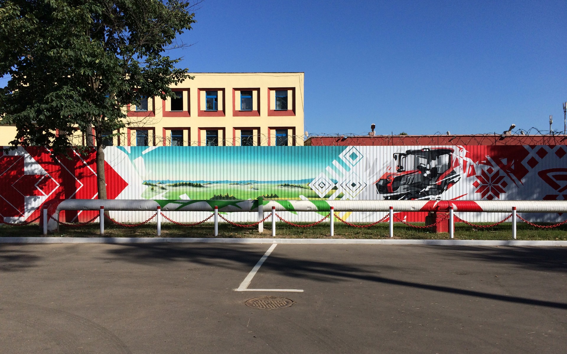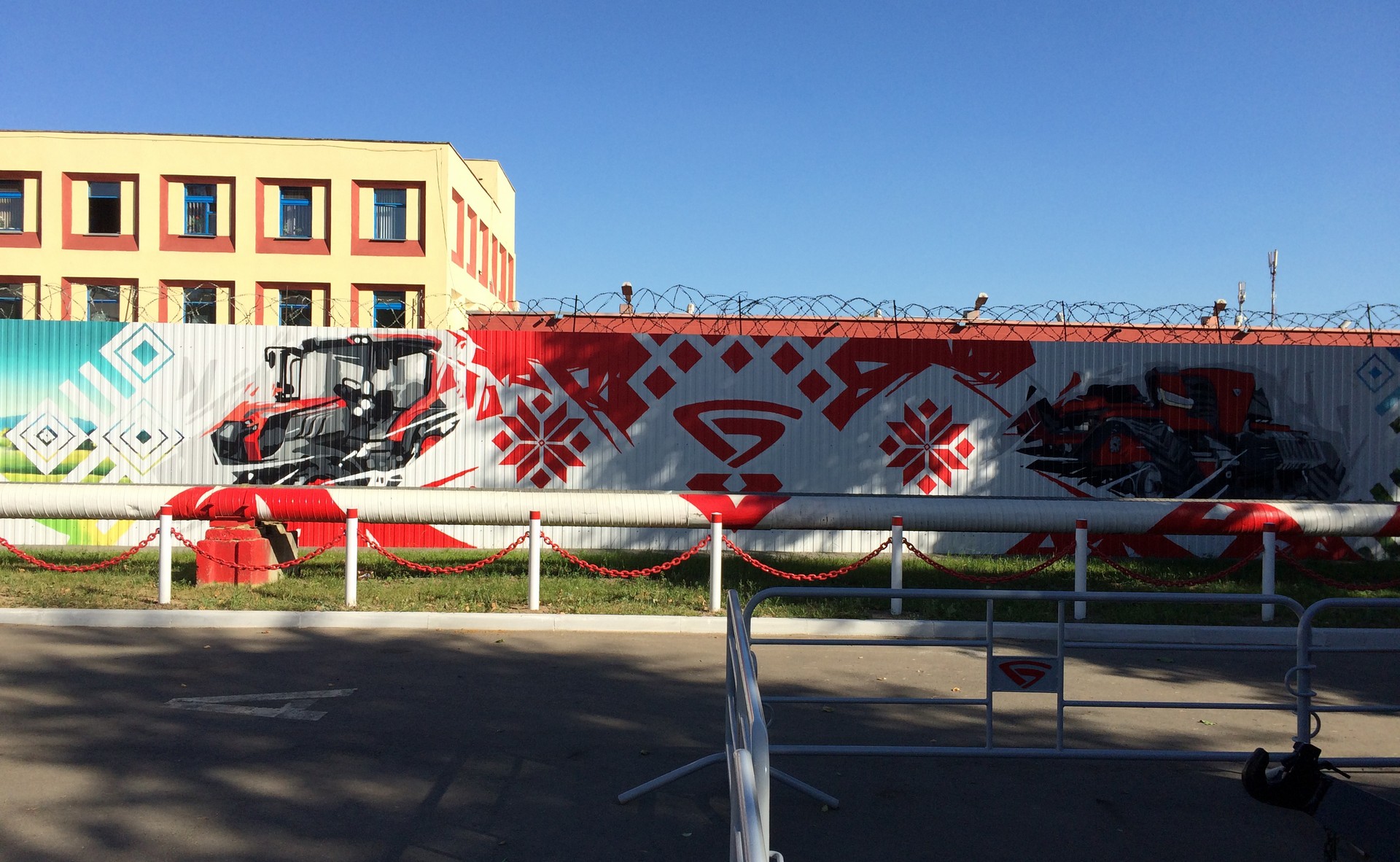 Роспись забора выполнена в фирменных узнаваемых цветах завода, с использованием элементов белорусского орнамента, техники прошлого и будущего. На одной из сторон забора разместился 3Д рисунок сверх мощного трактора «BELARUS-4522».