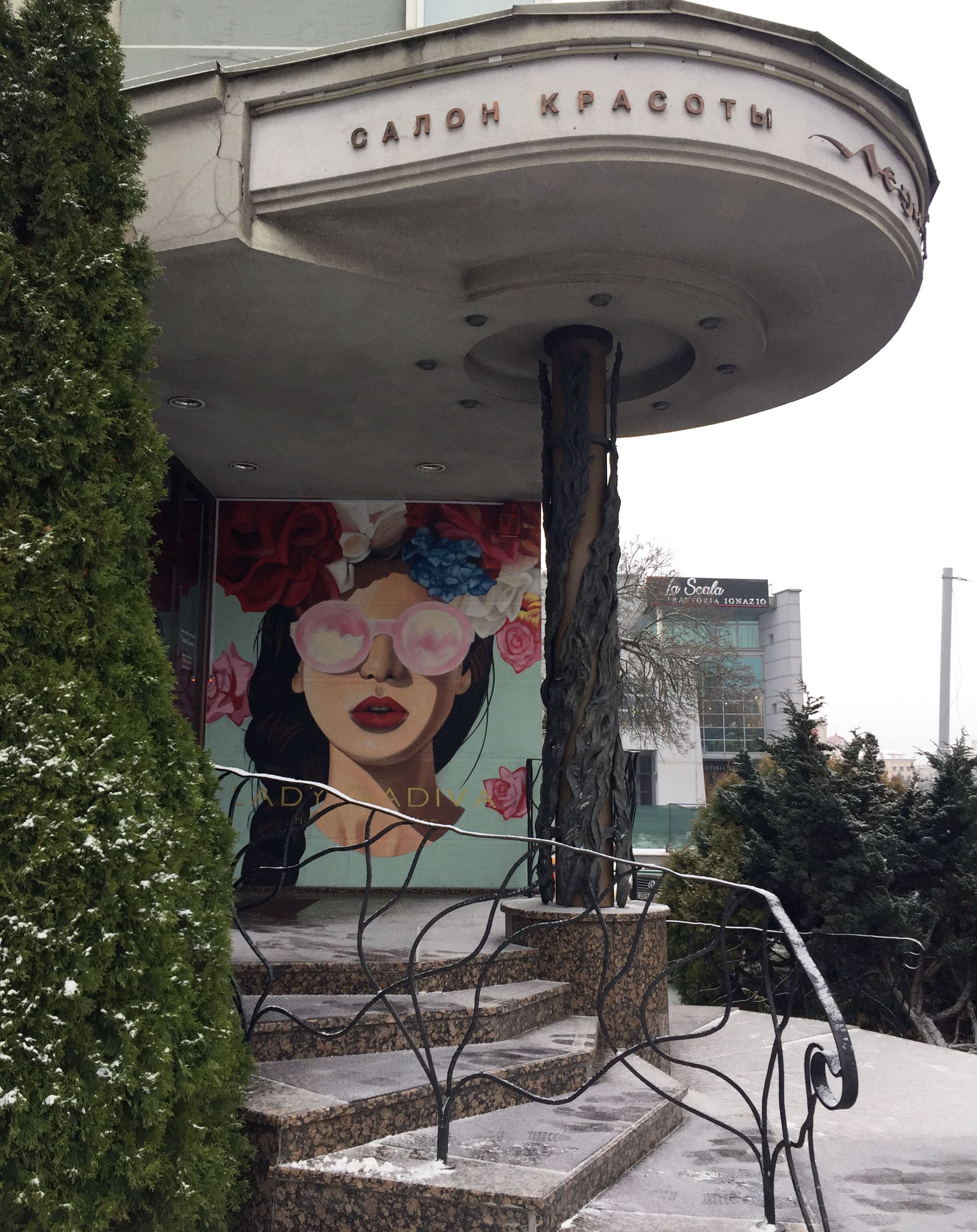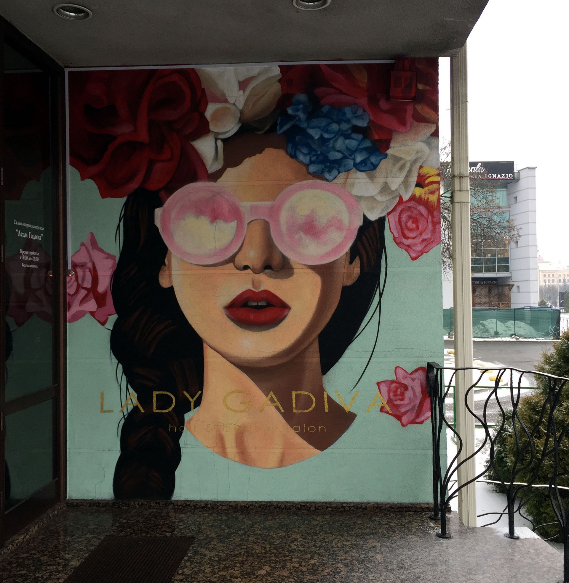 Яркий персонаж, рисунок на стене для салона красоты.
